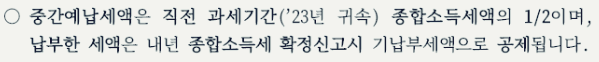 - 중간예납 금액은 전년도 소득세액을 기준으로 계산됩니다.