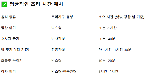 태양열 조리기구는 2~4배 느리다. vs. 생각보다 잘 익는다.